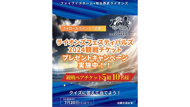 株式会社ファイブイズホームは、2024年7月8日(月)から7月20日(土)までの期間、「ライオンズフェスティバルズ2024観戦ペアチケットプレゼントキャンペーン」を実施します!