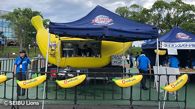 駅前広場のユニフルーティージャパン特設ブースでは、当日限定で『陽当りライオンズバナナ』や『金の房プレミアムバナナミルクジュース』を販売するほか、合計590名さまにライオンズ選手直筆サイン入りユニフォームなどがあたる抽選会など、イベントが盛りだくさんです。