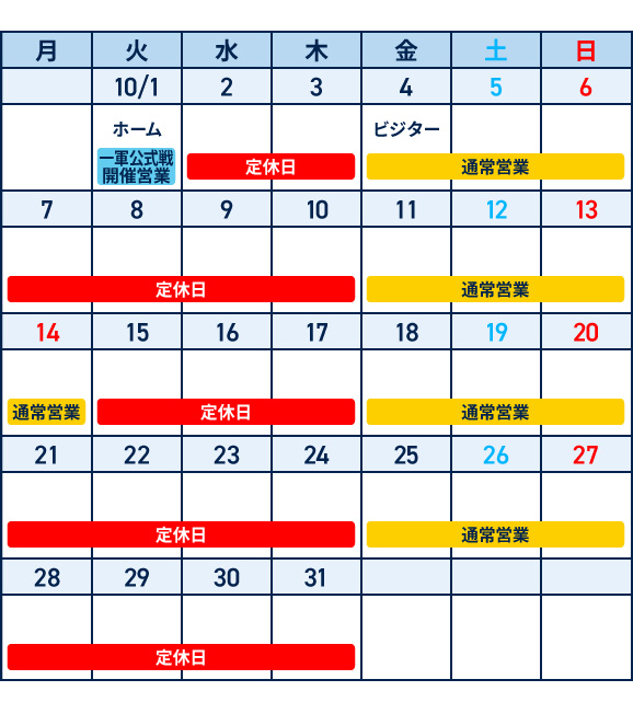 10月のチームストア各店の開催日における営業時間、チームストア フラッグスの定休日をご案内いたします。