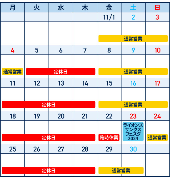 MY PAGEチームストア フラッグスの11月定休日・臨時休業およびライオンズストア@大宮アルシェの営業時間変更をお知らせいたします。