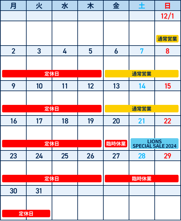 チームストア フラッグスの12月定休日・臨時休業日をお知らせいたします。(12月20日(金)はLIONS SPECIAL SALEの準備のため誠に勝手ながら臨時休業とさせていただきます。【12/9更新】)