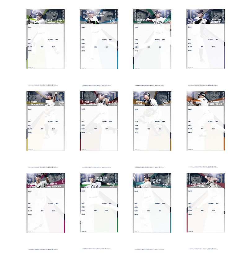2025シーズンの紙チケットデザインが決定いたしました!昨シーズン新人王を獲得した武内投手など12種類をご用意いたしました。 ベルーナドームチケットセンター、ライオンズストア各店舗でチケットを購入される際、このデザインの紙チケットで発券いたします。 また、ライオンズチケット(web)での購入でも、この選手デザインの紙チケットで発券することが可能です。詳細は下記内容をご確認ください。
