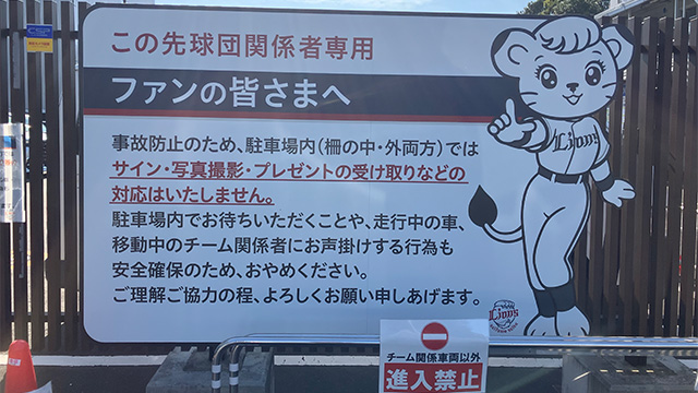 トレーニングセンター』に隣接する当球団の選手駐車場付近(ブルーパーキング)にて、走行中のチーム関係者の車にお声かけされたり、駐車場入口付近にてファンサ―ビスを求められたりするお客さまがいらっしゃいます。