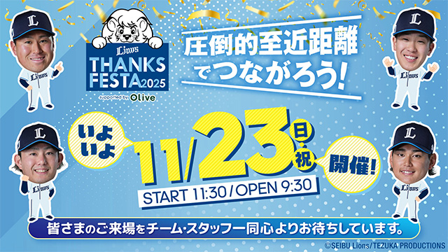 ファンの皆さまへ感謝の気持ちを込めて、今年のライオンズサンクスフェスタは選手をもっと身近に感じられる、心温まる1日をお届けします。皆さまのご来場、心よりお待ち申しあげます!