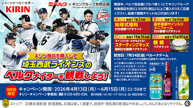 キリングループ(キリンビール/キリンビバレッジ/メルシャン)は、ベルク全店(クルベをのぞく)で4月13日(月)~6月15日(月)まで「キリン商品を購入して埼玉西武ライオンズの『ベルクナイター』を観戦しよう!」キャンペーンを実施します。