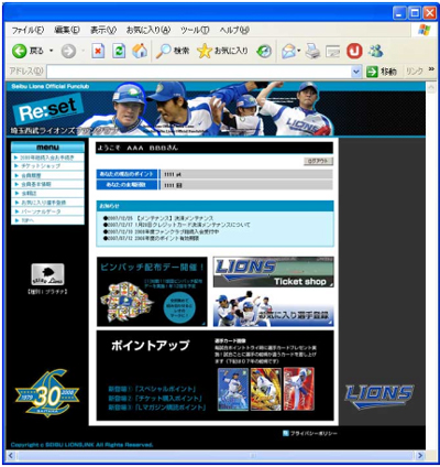 お気に入りの選手を登録して壁紙やポイントが貰えたり、パソコンや携帯電話でチケットをファンクラブ価格にて購入できたり、獲得したポイントが照会できたりと、ファンクラブ会員垂涎の機能を満載!