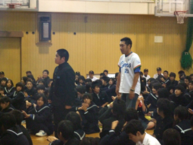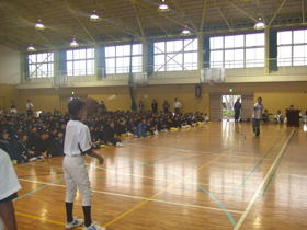 また、全校生徒の前で野球部員と女子ソフトボール部員の生徒を対象に大塚氏が基本指導を行い、大変楽しい時間を過ごし、大塚氏もたくさんの元気を部員からもらっておりました。
