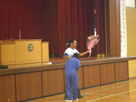 | 全校生徒の前でキャッチボールの実演 | 生徒代表より花束の贈呈 |