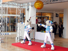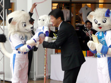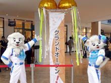 MY PAGE| 4月10日(木)に埼玉県・入間市三井アウトレットパーク入間グランドオープンニングセレモニーに球団マスコットキャラクターレオとライナがお祝いに駆けつけました。 あいにくの天候でしたが大勢のお客さまが見守る中、セレモニーがスタートしました。司会者より「本日のグランドオープンをお祝いに駆けつけてくれました! 埼玉西武ライオンズのマスコットキャラクター、レオ君とライナちゃんです!」と紹介されると拍手と歓声が沸き起こりました。 「レオ君、ライナちゃん」と言う歓声の中、ステージ上で球団歌『地平を駆ける獅子を見た』に合わせパワフルなダンスでオープニングセレモニーを盛り上げていました。 三井アウトレットパーク入間へ今後の更なる発展・ご活躍を願い、レオ君とライナちゃんより『特大レオぬいぐるみ』が金沢所長に贈呈されました。 最後に司会者の合図に合わせてくす玉開きに参加してお客さまの盛大な拍手の中、セレモニーも終了いたしました。 | レオとライナのダンスショー! 特大レオぬいぐるみの贈呈 盛大にくす玉開き!! |
