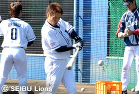 | ノックを受ける中村選手と石井義人選手 | 感触を確かめつつティーを行う片岡選手 |
