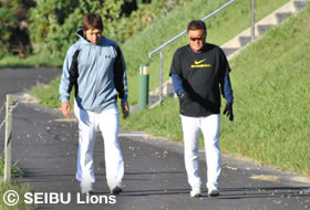 中島選手の朝は大迫コーチとのウォーキングで始まります。一周2kmのコースをじっくり時間をかけて歩き、身体を目覚めさせてからいざ練習へ。特に力を入れている守備練習では連日の疲れも見せず、ノック、特守とも積極的に声を出して元気いっぱいグラウンドを駆け回りました。