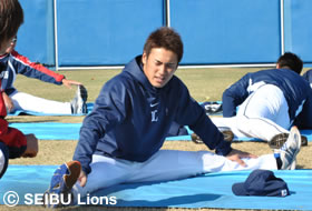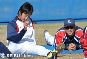 | 野上投手&中島選手 ストレッチ中! | 元気にノックを受ける中島選手 |