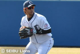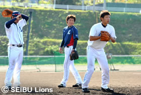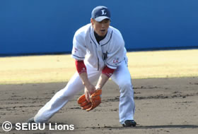 | 軽快な守備を見せる片岡選手 | 中島選手と特守を受ける原&浅村選手 |