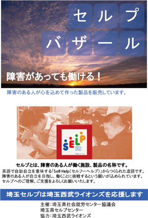 埼玉西武ライオンズでは、球団が取り組んでいる社会貢献への一環として埼玉県社会就労センター協議会事務局と連係し、県内の障害のある人たちが働く施設・埼玉セルプセンターの方々が作った製品の販売会・セルプバザールの開催に賛同、バザールを誘致することになりました。