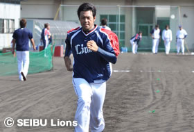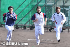 | 走りこみを行う田中投手と帆足投手、武隈投手 | 走り込みで足腰を鍛える木村投手 |