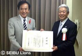 MY PAGE| 11月5日(木)、埼玉会館大ホールにおいて、平成21年度埼玉県社会福祉大会が開催され、埼玉西武ライオンズは、「社会福祉事業協助者」として埼玉県知事から感謝状を贈られましたのでご報告させていただきます。 この感謝状は、社会事業に理解と熱意を有する個人、又は団体が対象とされ、社会福祉に対して協力を行い、その功績が顕著であり、他の模範と認められる方々に贈られます。 埼玉西武ライオンズでは、毎年5月の「児童福祉週間」に伴い、埼玉県内の児童福祉施設に在所する児童を対象に試合観戦招待事業を実施しております。 今後も埼玉西武ライオンズでは、青少年育成に寄与する活動の一環として継続的に活動を推進してまいります。 | ![]() |