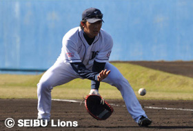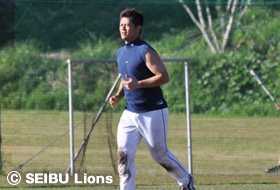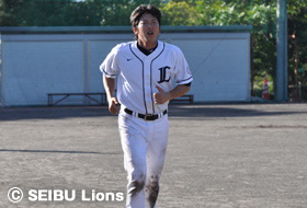 上本選手はこの秋から試合出場機会を増やすため、外野守備の練習もおこなうようになり、ノックでもレフトを守るなど貪欲に練習に取り組んでいます。個人強化練習でも外野組で参加し、後藤選手、高山選手、松坂選手と一緒にボールを追っていました。