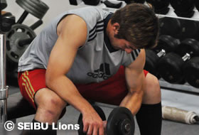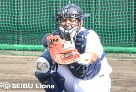 銀仁朗選手は今年ライオンズのホームベースを守り通し、涌井投手とバッテリー賞に輝くなど、今年本当に成長した選手と言えます。このキャンプでも率先して声を出し、チームを盛り上げています。全体練習が終わった後の個人強化練習ではスローイングを中心に取り組んでいました。