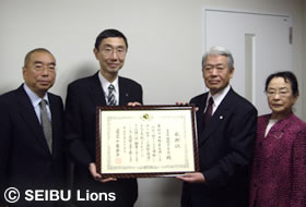 MY PAGE| 11月25日(水)、埼玉西武ライオンズは、法務省が主唱する「第59回社会を明るくする運動」に対する活動について「法務大臣感謝状」が授与されましたのでお知らせいたします。 社会を明るくする運動とは、すべての国民が、犯罪防止と罪を犯した人たちの更正について理解を深め、犯罪や非行のない明るい社会を築こうとする全国的な運動です。 埼玉西武ライオンズでは、犯罪や非行のない明るい町づくりのために、埼玉県の「社会を明るくする運動」の広報活動などに協力して参りました。今後も埼玉西武ライオンズでは、継続的にこの活動を推進して参ります。 | 小林信次社長へ感謝状の贈呈 |