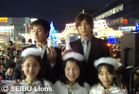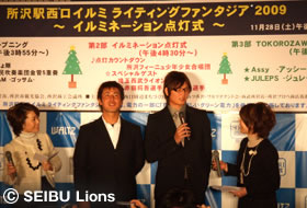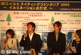 MY PAGE11月28日(土)、所沢駅西口ワルツビル2階ぺデストリアンデッキ特設ステージにて実施された「所沢駅西口イルミライティングファンタジア2009」のイルミネーション点灯式に涌井秀章投手、赤田将吾選手が参加いたしました。