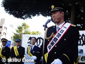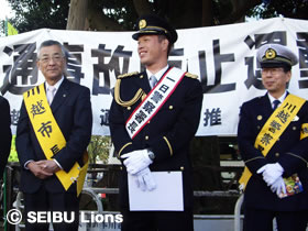 石井義人選手は、「冬の交通事故防止運動」と「高齢者の交通事故防止街頭キャンペーン」に伴う活動として、西武鉄道本川越駅前ペペ広場で力強く市民に交通事故防止を訴え、街頭パレードでは、市民のみなさまとふれあいを行いました。
