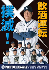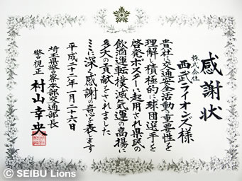この感謝状は、飲酒運転に対する意識を一層高め、飲酒事故を防止する理解を深めていただくことを目的に、ラ イオンズの選手を起用した啓発ポスターを作成し、県民へ飲酒運転撲滅気運の高揚・浸透への貢献に対して贈られました。
