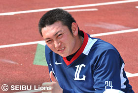 | トレーニングの合間に笑顔を見せる岩崎投手 | シートバッティングの順番を待つ選手 |