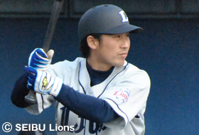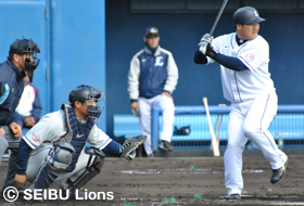 | 紅白戦でマスクを被る細川選手 | 右翼越え二塁打を放った吉見選手 |