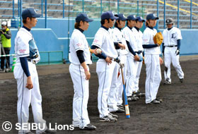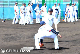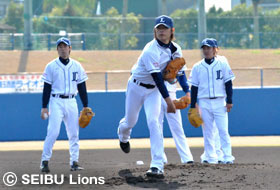 | 野手陣の走塁練習 | 投内連係を見守る潮崎コーチと投手陣 |