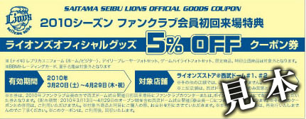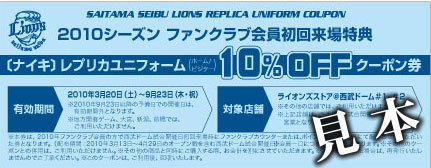 2010年ファンクラブ会員限定で、ファンクラブカウンター、ポイントアップブースにて期間中初回来場ポイントアップ時に、ライオンズストアで使用できるクーポン券2種類を配布いたします。