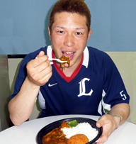 MY PAGE大人気の選手プロデュースグルメに新メニューが登場。 石井義人選手のこだわりカレーには、じっくり煮込んだ玉ねぎ・にんじんなど野菜の旨みをとじこめたルーに豚肉などの具が入り、食べごたえ充分。 さらに、カレーとの相性抜群のとろ~りカニクリームコロッケをトッピング。 石井義人選手の自信作!極上カレーをぜひご賞味ください。 | ![]() |