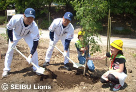 MY PAGE| 埼玉西武ライオンズが取り組んでいる社会貢献活動の一環として、5月16日(日)本庄総合公園市民球場で行われた、イースタンリーグ公式戦(対読売ジャイアンツ戦)の試合前に「みんなで森をつくる集い」第61回埼玉県植樹祭が開催され、埼玉西武ライオンズ行澤久隆二軍監督・岩崎哲也投手が参加いたしました。 この活動は、「広げよう 豊かな緑 世のため後のため」を理念として、森林の大切さや保全の必要性に対する県民の意識を高めながら次世代に広め、社会全体で森林を守り育てていくことを目的に開催されました。 |