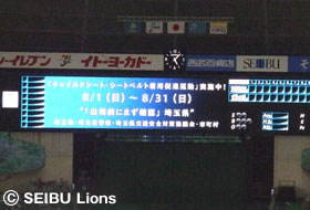 埼玉県では、夏休みに伴い行楽地への外出や旅行などの交通手段として、自動車での移動が増える8月の1ヵ月間「チャイルドシート・シートベルト着用促進運動」を実施しており、ライオンズもこの運動に賛同。チャイルドシートおよびシートベルト着用の義務と必要性を、試合開始前にLビジョンと場内放送にて、来場者の皆さまへ呼びかけをいたしました。
