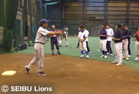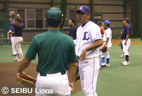 野球指導に携わっている指導者や、これから指導者を志す方々を対象に行われ、福島孝二(ファームディレクター)校長をはじめ、埼玉西武ライオンズ2軍スタッフによるコーチング指導を行いました。