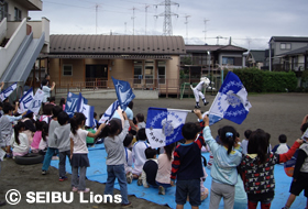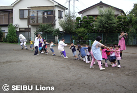 吾妻保育園(全園児115名)では、ライオンズ応援フラッグを振って歓迎してくれた園児たちの前に、颯爽とレオが登場しました。園児たちからの質問に答えた後、園児たちと一緒に元気よく「エビカニクス」を踊りました。4歳児・5歳児とは綱引きも行い、楽しい時間を共に過ごしました。