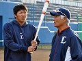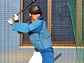 | アーリーワークでは土井コーチのマンツーマン指導を受けた上本選手。この後、スタジアムに快音を響かせていました。