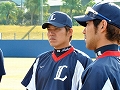 銀仁朗選手のこの格好は!?死球を交わす練習用の防具でした。 この姿には他の選手も興味津々でした。