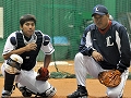 | 光山コーチのアドバイスを受けながら、捕球姿勢のチェックを行う岳野選手。 来季は一軍での活躍を期待しています!