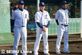MY PAGE12月5日(日)、伊奈町記念公園において市内少年野球チームに在籍する120名の児童を対象に、「埼玉西武ライオンズ野球教室」が開催され、木村文紀投手・大島裕行選手・黒瀬春樹選手が講師を務めました。