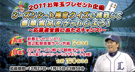 2011シーズンシート(年間予約席)」に関する検定クイズに正解した方の中から、新春メッセージ入り渡辺監督直筆サイン色紙を抽選で5名さまに、西武ドーム開催の2011オープン戦に抽選で合計80組160名さまをネット裏スペシャルシートまたはベンチサイドシートにご招待いたします!