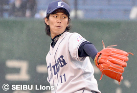 1回裏、先発・岸がマウンドへ。次第に強く降る雨の中、ヒットを打たれるも後続を断つ。