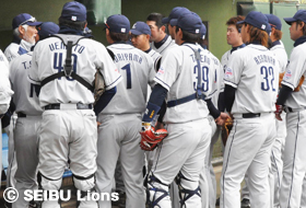 ベンチにいる平尾選手が戻ってきた林崎選手に冗談で「もう所沢に戻っていいよ。監督も気をつかって呼んでくれたんだよ」と一言声をかけると監督含めみんなが笑い、ベンチも和やかなムードになり13時30分試合開始となりました。