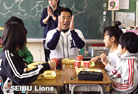 6年生の教室で給食を共にした後は、場所を体育館に移し講演を行い、自身の野球人生を通して得た教訓を児童たちに熱く訴えかけました。