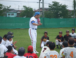 ポジション別の指導では投手編を担当しました松沼さんがバランスを意識した足の上げ方、両手を両肩に乗せての練習方法などマウンド上で最大限に生かせるフォーム指導をして子供たち以上に父兄の皆さまが真剣に聞き入っておりました。