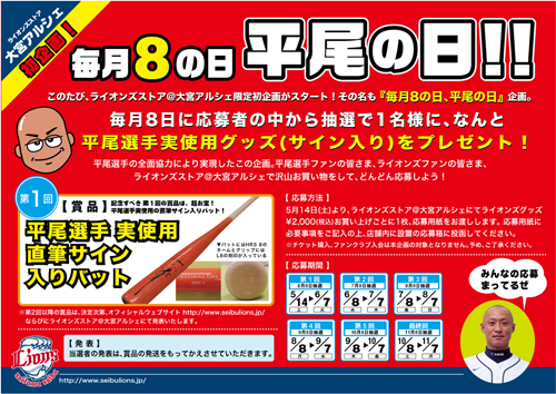 平尾選手ファンの皆さま、ライオンズファンの皆さま、ぜひこの機会に、ライオンズストア@大宮アルシェへご来店ください。