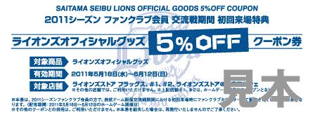 5月18日(水)~6月12日(日)の交流戦期間中、2011年FC会員限定で、ファンクラブカウンター・ポイントアップブースにて、初回来場ポイントアップ時に、ライオンズストアで利用できるクーポン券を進呈します。