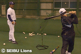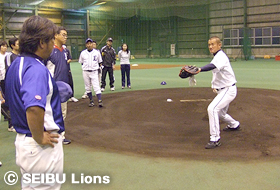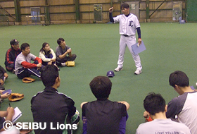 野球指導に携わっている指導者を対象に、福島孝二(ファームディレクター)校長をはじめとする埼玉西武ライオンズ二軍スタッフによるコーチング指導を行いました。