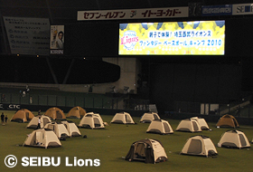 体験型ワークショップ、ナイター試合観戦、ライオンズOB選手とのふれあい、試合が終わった後のフィールドでテント張り、テント・スリーピングバック(寝袋)を用いてキャンプ、ベースボールクリニックなど夏休みの貴重な思い出の時間として盛りだくさんの内容を予定しております。