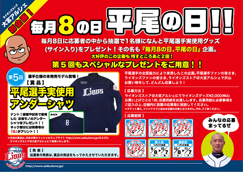 第5回の賞品は、『平尾選手実使用アンダーシャツ』!!