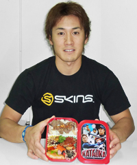 また、期間限定でモデルチェンジするオリジナル容器は、片岡選手の今年の勝負カラー“赤”を基本とした、お弁当箱として再利用しやすいBOXタイプにリニューアル。また、OWNERS LEAGUEカード(SUPER STARカード)・BOXバージョン限定お弁当オリジナルカード3種類の全4種類のカードのうち、1種類が入っています。